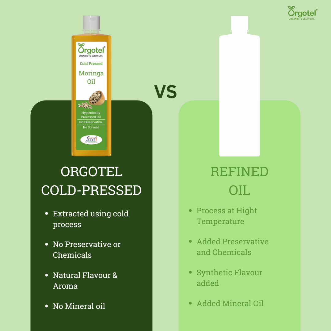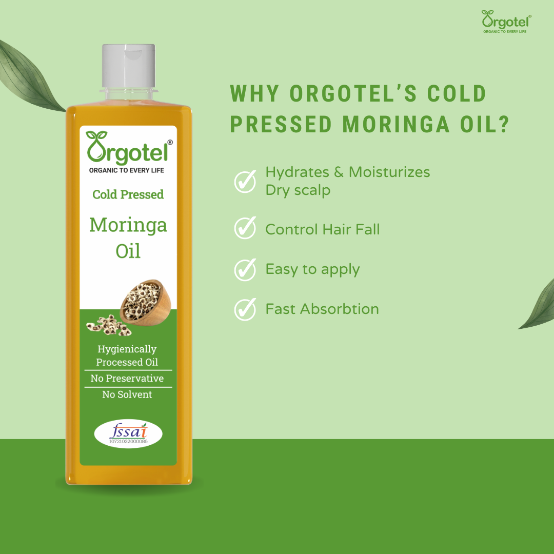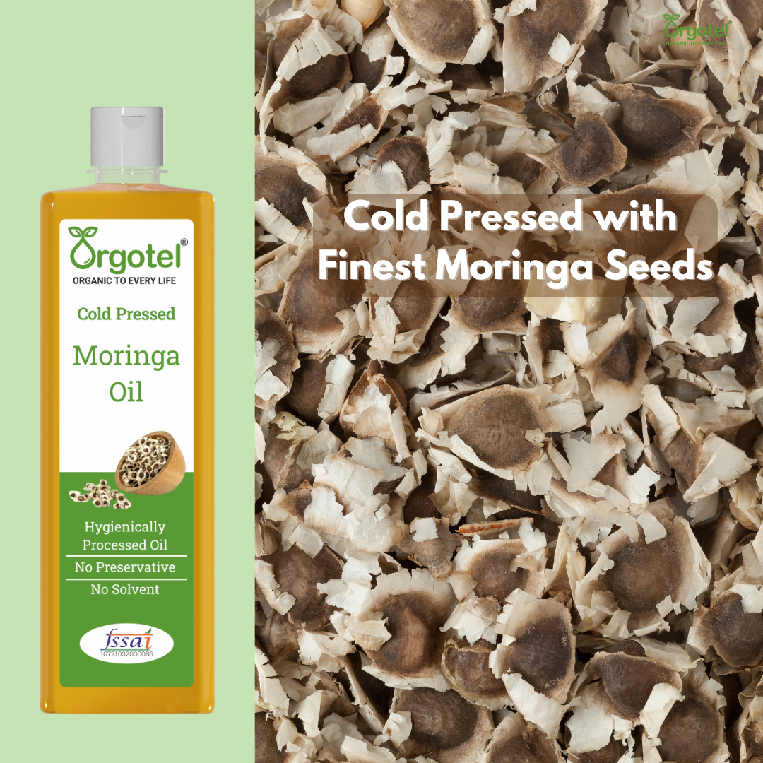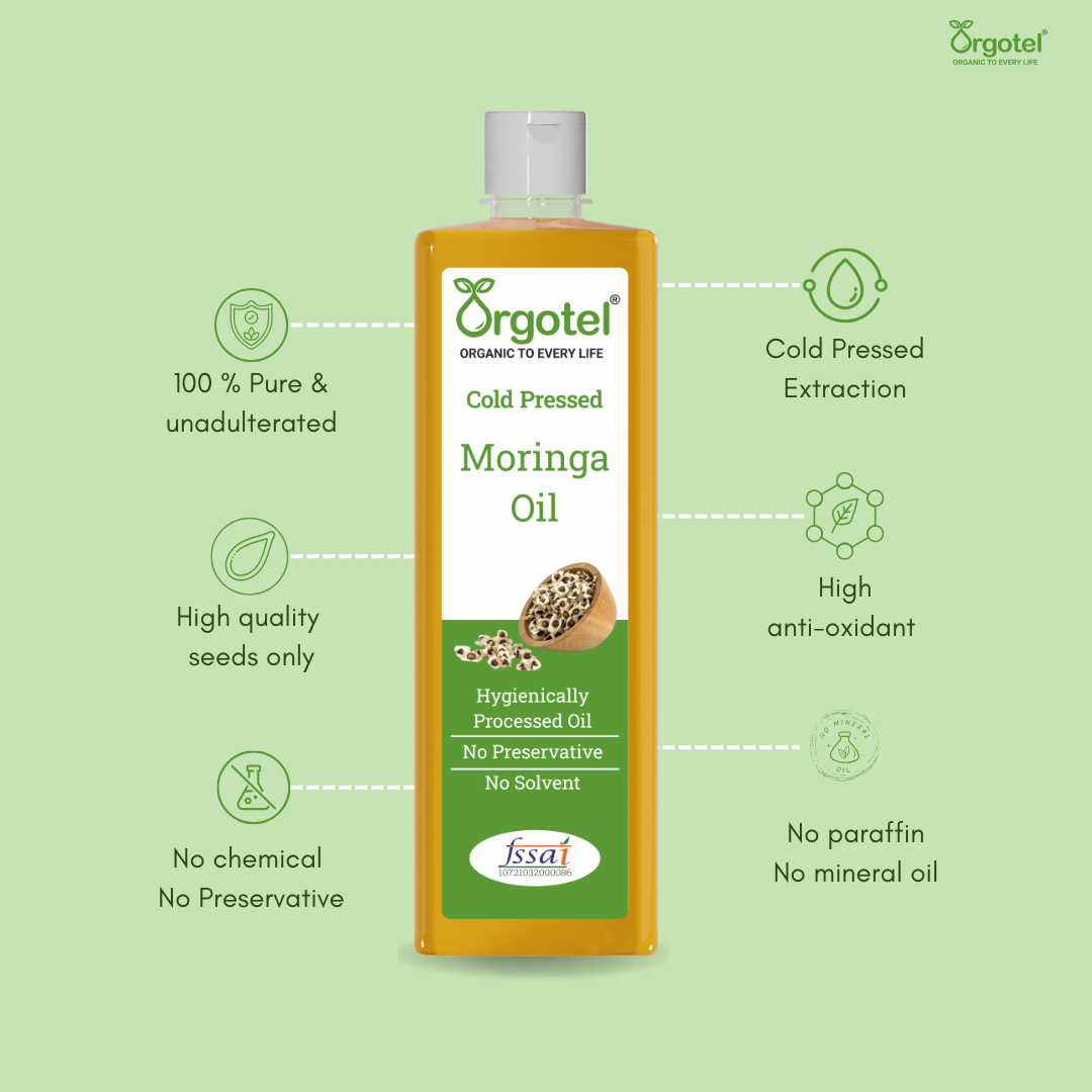 Orgotel’s Moringa Cold-Pressed Oil is a multi-purpose elixir derived from handpicked Moringa oleifera seeds using a traditional wooden (kachi ghani) method. Packed with antioxidants, vitamins A, C, and E, and omega fatty acids, this oil offers powerful anti-aging, moisturizing, and healing properties. Its fast-absorbing and non-greasy texture makes it ideal for skin care, hair growth, and even as a massage oil. Completely free from additives and chemicals, it is your go-to natural solution for holistic health and beauty.